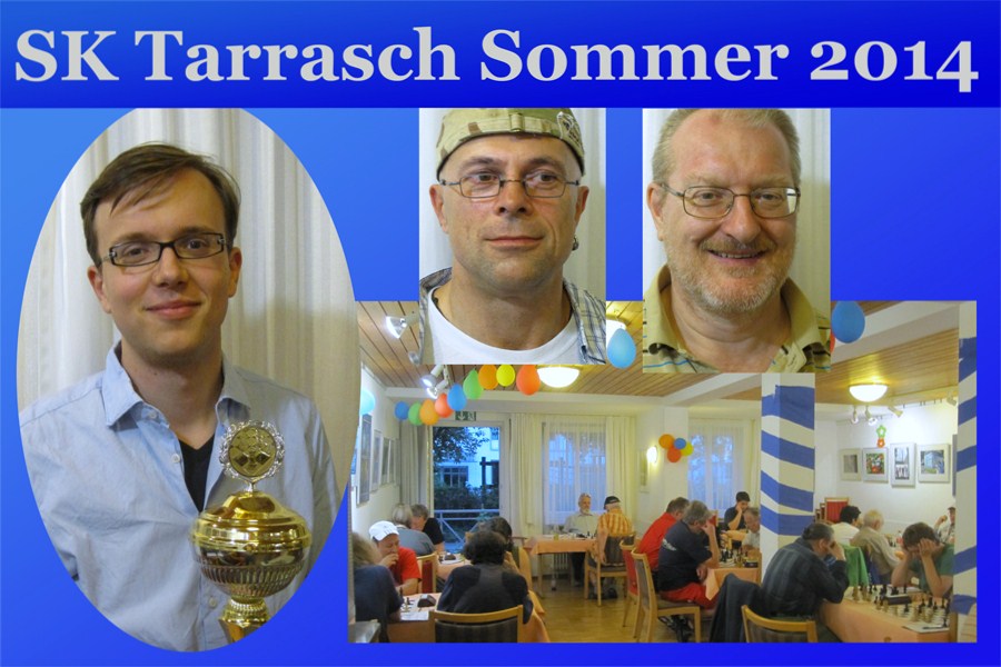 Tarrasch-Sommerpokal 2014: So schauen Schach-Sieger aus vlnr.: strahlende Gesichter beim 1.Sieger Julian zur Lage (mit Wolfgang-Unzicker-Pokal", beim 2.Sieger Guido Guggenberger, und beim 3.Sieger Gerhard Rasch; unten: Blick in den gemütlichen Turniersaal im ASZ am Kolumbusplatz (Spiellokal des SK Tarrasch-1945)